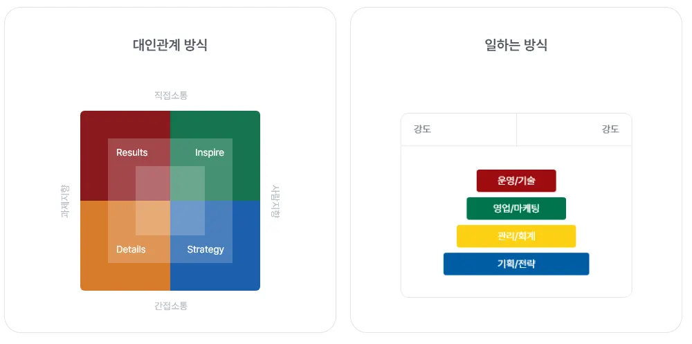 흥미, 평소 행동(강점), 욕구( 필요로 하는 자원), 스트레스 등을 네가지 색상으로 분류하여 자신과 타인의 행동 패턴을 이해하는 것을 목표로 맞춤형 자기계발 및 대인 관계 방식과 업무처리 방식을 보여주는 Life & Work 종합진단도구 입니다.